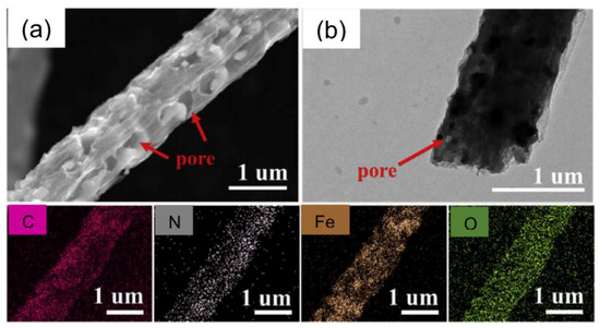 (a) SEM and (b) TEM images of the composite γ-Fe2O3/C fibers, with elemental mapping at the bottom (reproduced from reference [136] with permission. Copyright 2018, Elsevier).