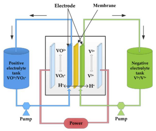 As mentioned above, the predicted severe shortage of the lithium reserves in less than 65 years [105] will result in serious concerns for the future production costs of LIBs, whereas the SIB technology has not reached the needed maturity yet. In this scenario, the secondary redox flow batteries (RFBs) gather great interest among the traditional large-scale EESs. They can convert chemical energy into electricity by the oxidation-reduction reactions of positive and negative reactants [142]. Thanks to their excellent performance in terms of efficiency, life cycle, environmental friendliness, and low toxicity, particular attention is devoted to vanadium-RFBs, considered prospective future EESs since vanadium is more abundant in nature than lithium and its cost is much lower. In a first-generation vanadium-RFB [143], positive (VO2+/VO2+ sulfate) and negative (V2+/V3+ sulfate) electrolytes are stocked in tanks, and a proton-exchange membrane separates the electrodes in the reaction cell (Figure 16). The energy conversion in the cell occurs through the chemical reaction VO2++ H2O + V3+ ↔ VO2+ + 2H+ + V2+ (E0 = 1.26 V), with VO2++ H2O ↔ VO2+ + 2H+ + e− (E0 = 1 V) and V3+ + e− ↔ V2+ (E0 = −0.26 V) reactions taking place at the positive and negative electrode, respectively [142,144,145].