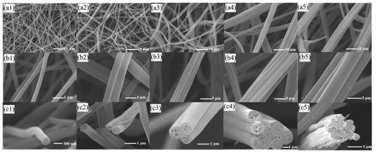 (a1–a5) SEM images of bundled porous carbon fibers after carbonization (polystyrene (PS) content in the bicomponent precursor solution: 0–10 wt%, from left to right). (b1–b5) High-resolution SEM images of fiber bundles (PS content: 3–10 wt%, from left to right). (c1–c5) Cross-sectional views of bundled fibers obtained with 0–10 wt% PS content (reproduced from reference [153] with permission. Copyright 2018, Elsevier).