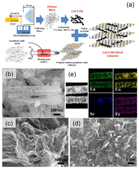 (a) Schematic illustration of the La0.5Sr0.5Co0.8Fe0.2O3 porous nanorods/nitrogen-doped reduced graphene oxide (LSCF-PR/NRGO) composite fabrication process. (b–d) SEM images of (b) LSCF-PR fibers, (c) NRGO and (d) LSCF-PR/NRGO composite. (e) Elemental mapping of the fiber components (reproduced from reference [161] with permission. Copyright 2014, Elsevier).
