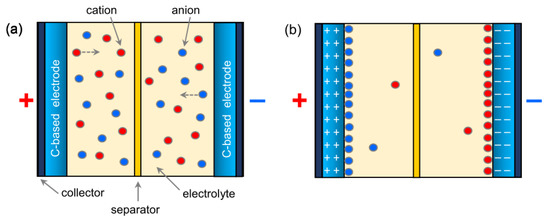 A wide branch of research on energy storage is focused on the electrochemical capacitors [174,175], better known as supercapacitors and also including pseudocapacitors. Supercapacitors and pseudocapacitors differ for the mechanism through which the charge is stored. In the former, the charge storage is based on the fast electrostatic interactions at the electrode surface in contact with the electrolyte (Figure 19)—during the charging process, the ions from the electrolyte are reversibly adsorbed on the high-surface-area electrodes, finally leading to an electrical double layer (EDL). In the latter, fast and reversible redox (Faradaic) processes mainly take place at the surface of the electrodes.