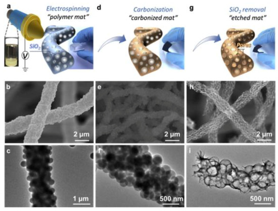 Owing to the very high theoretical specific capacity of silicon (4200 mAh/g), carbon fibers with embedded Si nanoparticles (NPs) have received great attention as a possible solution to the rapid capacity fading caused by the pulverization of the bare silicon electrode due to its mechanical failure upon repeated Li insertion and extraction. In particular, Xu et al. [82] have designed flexible non-woven membranes consisting of electrospun silicon/carbon@carbon fibers (Si/C@CNFs). The fibers, fabricated by the use of a co-axial electrospinning configuration (Figure 8a), exhibit a core-shell structure (Figure 8b–e), where the external shell is constituted by PAN-derived carbon, and the internal core consists of well-dispersed Si NPs wrapped to PVP-derived carbon. The Si/C core acts as an efficient conductive network (Figure 8f), enabling the membranes with 40 wt% Si loading to deliver up to 1507 and 555 mAh/g at current densities of 0.1 and 2 A/g, respectively [82]. Thanks to the buffering action of the PVP-derived carbon protecting Si NPs from the mechanical damage, after 500 cycles at a rate of 0.2 A/g, the electrode retains 86% of the initial capacity.