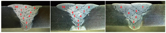 The base material plates were V-60 bevelled and tacked along the 500 mm edge to be welded. The root pass filled the complete groove length (500 mm), but every subsequent weld pass was shortened 50–70 mm in length from the previous weld pass length, as shown in Figure 2. The aim was to have one coupon containing the last (as-deposited) pass and the previous ones. Therefore, it was possible to obtain, for each weld pass, a section to characterize the weld and HAZ microstructure and to follow the evolution of the microstructure after each thermal cycle experienced by the material.