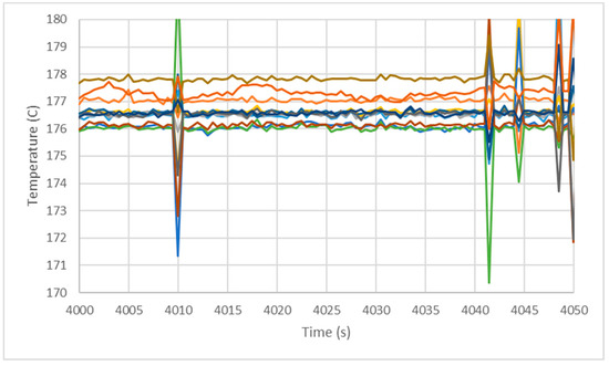 To prove the accuracy of the temperatures measured by the thermocouples, the FR weld was placed in a furnace with the 20 thermocouples used to monitor the temperature in the weld passes connected (see Figure 6). All the thermocouples yielded a signal and reacted to the heat pulses in the furnace. Most importantly, the measurements obtained in the furnace proved to be accurate, with a range of dispersion of only 2 °C.