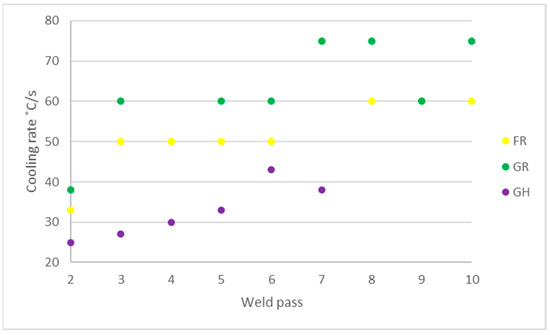 Average cooling rate between 1200 and 800 °C vs. weld pass number and welding procedure. Data for GR weld in Weld Pass 4 is not available because of a failure in the software that monitored the temperatures. The GH weld had only seven weld passes, which is why there are no data for Weld Passes 8, 9, and 10. Weld Pass 7 for FR and GR welds had exactly the same cooling rate (75 °C/s), which is why only one point is shown.