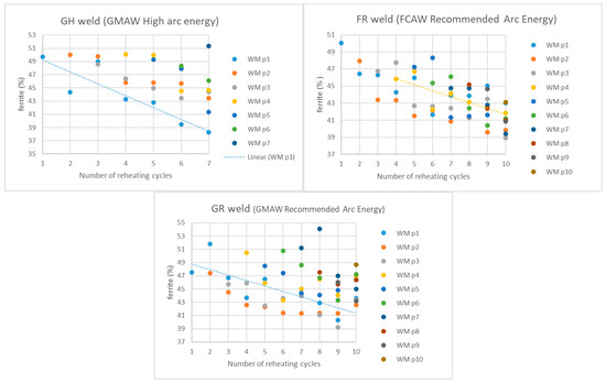 Ferrite content (Y-axis) measured by magnetic permeability pass by pass to evaluate the influence of the successive reheating on the ferrite content. A progressive reduction in ferrite content was observed in the weld metal. For better clarity of the reduction in ferrite, dotted lines show a linear regression of ferrite content in specific weld metal passes (Weld Pass 1 in the GH and GR welds and Weld Pass 4 in the FR weld). “WM pX” means the weld metal deposited in Weld Pass X.