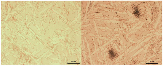 Micrographs of Weld Pass 1 in the GH weld. (Left) As-deposited. It shows Widmanstätten austenite laths within the ferritic matrix. (Right) After six reheating cycles. Widmanstätten austenite laths grew (an average of 4 μm thicker) and secondary austenite (small needle-shaped) was formed in the intragranular areas of the ferritic matrix.