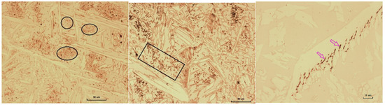 As expected, the difference in the absorbed energies was in connection with the oxygen content measured in the welds (Figure 16) and consequently with the amount of micro-inclusions observed in the weld metal (Figure 17). There was a higher oxygen content, a higher amount of micro-inclusions in the FR weld, a lower oxygen content, and a practically unnoticeable amount of micro-inclusions in the GR weld.