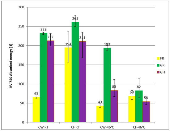 Charpy-V impact toughness specimens were extracted from the center of the weld section aiming to assess both the absorbed energy in the weld metal and in the HAZ. The measurements obtained in both locations in the three welds exceeded the acceptance criteria 27 J of average absorbed energy at −46 °C with no single values below 70% of that average value according to Norsok M-601 [20]. Figure 15 summarizes the results and confirms that FR welds showed the lowest toughness, and GR showed the highest, with GH weld toughness in between. It is interesting to note that, in the FR weld, the toughness in the weld metal was lower than it was in the HAZ.