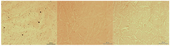 The ferrite content in the as-deposited condition and after the last reheating cycle were compared in Weld Pass 1 (the pass experiencing the largest number of reheating cycles). The GH weld showed the highest decrease with 12% ferrite reduction, the FR weld showed a decrease of 7% ferrite, and the GR weld showed a 4% ferrite reduction. The progressive increase in austenite content of the weld metal caused by subsequent reheating was confirmed by metallographic inspection (Figure 9). New austenite was formed: in the intragranular zones with the formation of secondary austenite, with the growth of the Widmanstätten austenite laths and with the growth of intergranular austenite.