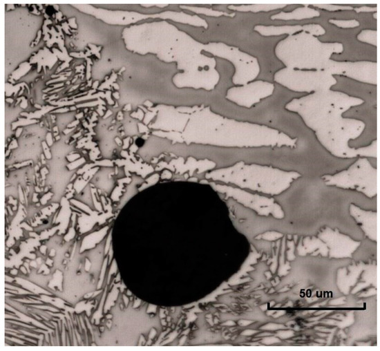 A pore (in black) surrounded in the majority of its perimeter by austenite phase (in white).