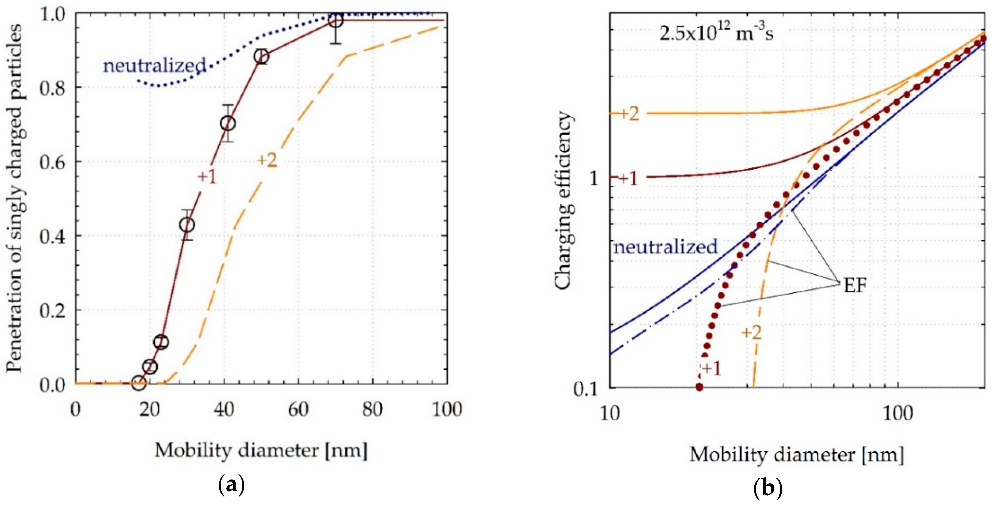 - Reischl, G.; Mäkelä, J.; Karch, R.; Necid, J. Bipolar charging of ultrafine particles in the size range below 10 nm. J. Aerosol Sci. 1996, 27, 931–949. [Google Scholar] [CrossRef]