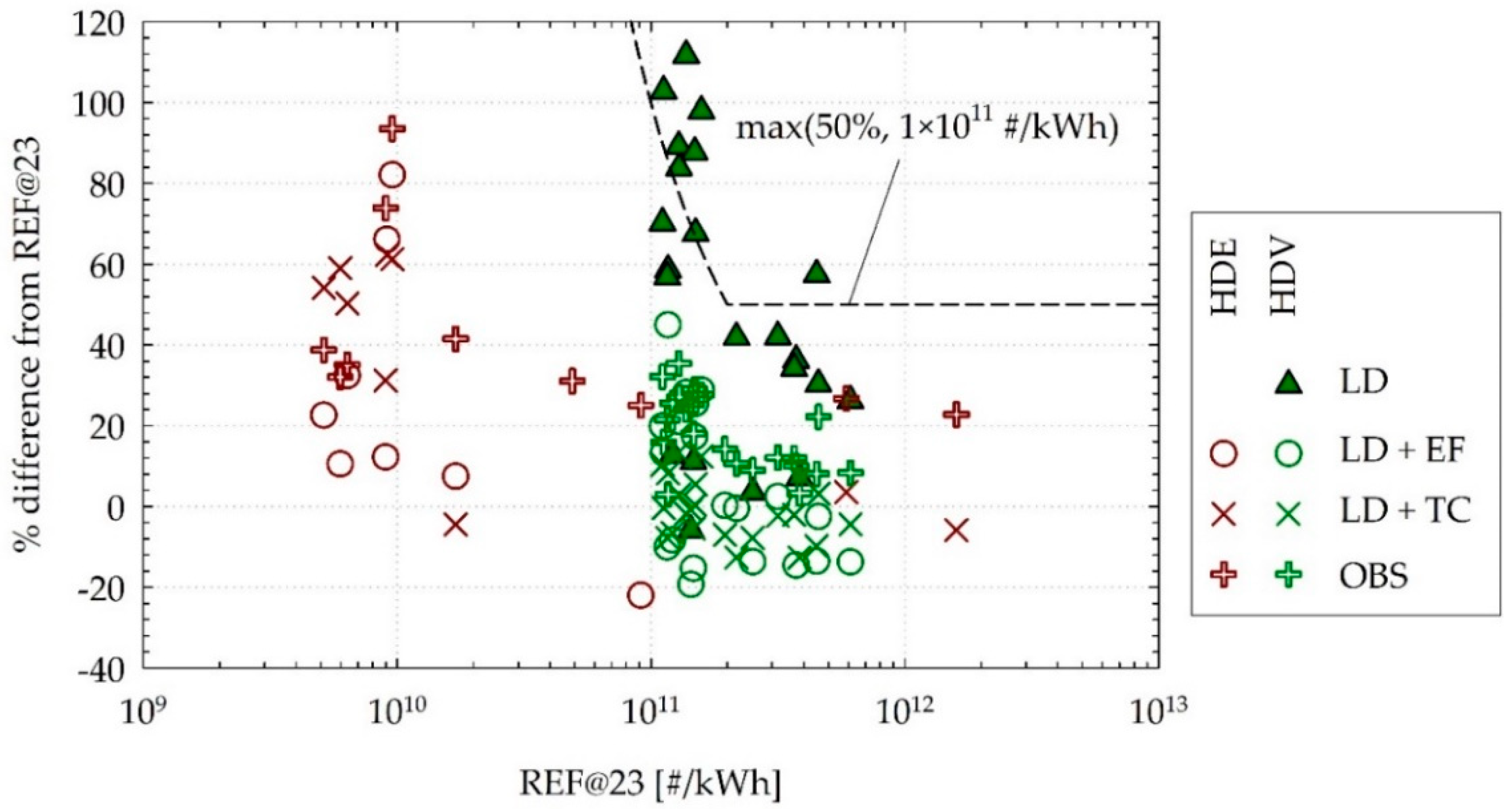 - Giechaskiel, B.; Riccobono, F.; Bonnel, P. Feasibility Study on the Extension of the Real Driving Emissions (RDE) Procedure to Particle Number (PN): Chassis Dynamometer Evaluation of Portable Emission Measurement Systems (PEMS) to Measure Particle Number (PN) Concentration: Phase II; Ispra: EU Report 27451; Publications Office of the European Union: Luxembourg, 2015. [Google Scholar]