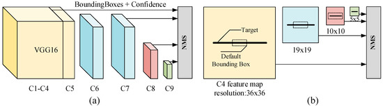 (a) Single shot multibox detector (SSD) architecture. From the convolutional layers C1 to C9, a number of bounding boxes and their corresponding confidence are inferred. (b) Fixed size default bounding box on different resolution feature maps. The fixed size default box captures different-sized targets in different resolution feature maps. This architecture allows the SSD to capture both large and small targets in one shot.