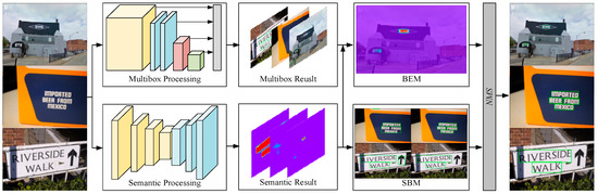 The proposed algorithm is shown in Figure 4. Plenty of text candidate bounding boxes were obtained from the multibox processing. Meanwhile, the text semantic segmentation result was obtained from semantic segmentation processing. A softmax layer was added to the output layer of the semantic segmentation process to obtain the classification probability of each pixel. The text candidate bounding boxes and semantic segmentation results are merged in the bounding box enhancement module (BEM) to eliminate the false results of multibox processing. The semantic segmentation result enter the semantic bounding box module (SBM). After the CRF algorithm optimizes the text boundaries, the text semantic bounding box is computed. Finally, the outputs of the BEM and SBM are sent to the non-maximum suppression (NMS) to remove duplicate bounding boxes.