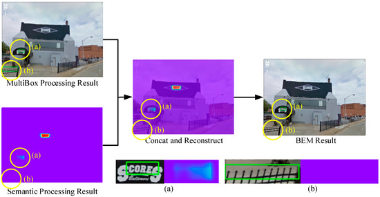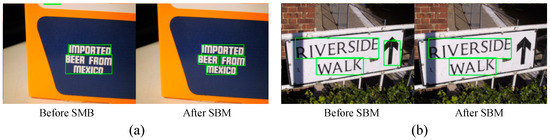 The BEM process is shown in Figure 5. It can be seen from the figure that region (a) is the text and the region (b) is the background. These two blocks are detected as text in multibox processing. From the heatmap of the semantic processing results, we found that region (a) was bright while region (b) was dark. After the processing of the bounding box enhancement module, region (a) was reserved and region (b) was discarded.