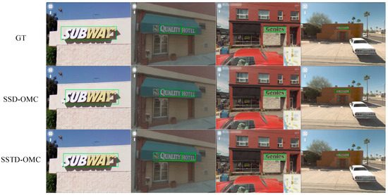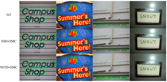 Table 3 shows the tested results of five methods on the ICDAR2013 dataset using two standard evaluation protocols. It can be seen from the test results that the SSD-OMC and SSTD-OMC algorithms showed an increase of 17.10% (IC13), 17.09% (DetEval) and 5.97% (IC13), 5.04% (DetEval) in the recall rate relative to the SSD and SSTD algorithms, which means that more texts missed by the multibox processing was detected. The SSD-OMC method was 9.60% (IC13) and 10.93% (DetEval) higher than the SSD method in the F-measure score, and the SSTD-OMC method was 2.55% (IC13) and 4.36% (DetEval) higher compared to the SSTD method in the F-measure score, meaning that the multibox processing optimized by our algorithm had a better detection accuracy.