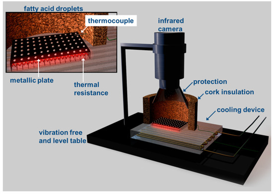 The experimental setup used for the IRT phase diagram estimation is similar to the one described in Reference [11] (see Figure 1). An aluminum plate is placed under the infrared camera (IR camera FLIR X6580 sc, Detection window: 1.5–5 μm). This plate is coupled with a thermal resistance, a cooling element, and a thermocouple allowing to record, measure, and control the temperature of the samples. This thermocouple is glued to the aluminum plate using silver paint and insulated from its environment with insulating foam.