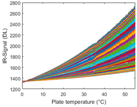 The first step of the data processing consists of identifying the pixels corresponding to each individual droplet in the recorded raw infrared images. The associated DL signals are then extracted, which allows to reduce the whole set of raw images to one single image by averaging the DL signals on time. This average image captures main information regarding the position of the droplets on the plate. Their segmentation by thresholding produces a new binary image in which all pixels unambiguously associated to the droplets are identified by a single value (1) and the rest of the pixels (background) are all 0-valued. The connected components of the binary image foreground are then split in a set of disjoined elementary objects (individual droplets). This is done using the general procedure outlined in Reference [11]. Once elementary objects have been conveniently labelled (each droplet on the plate is identified by a different arbitrary color), the DL signals associated to each droplet can then be easily retrieved. In the second step, a droplet-by-droplet analysis is carried out to identify the temperature at which each droplet undergoes a transition. As a droplet can have hundreds of pixels (depending on the size of the droplet), the disparity in the signal of each plotted pixel makes the determination rather difficult, as can be seen in Figure 2.