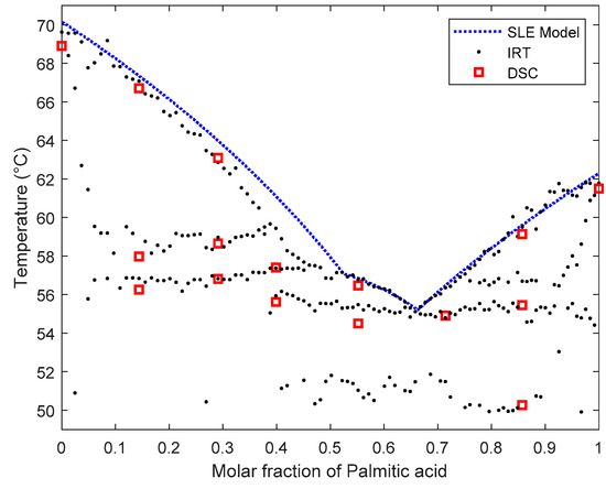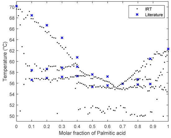 The phase diagram plotted from the IRT experiments is compared to the experimental data collected from Reference [15] in Figure 4. The obtained diagram is consistent with the literature one [15]. The method succeeds in detecting the liquidus line, the eutectic, the peritectic, and even the metatectic transitions. On the right part of the phase diagram of the phase diagram, a transition is detected around 56.7 °C. This latter would most likely be a metatectic one given the overall shape of the phase diagram and considering results found in literature for other fatty acids’ binary systems [15,25,26]. The presence of a metatectic transition implies the existence of a solid solubility domain. This domain is rather difficult to detect using the standard methods. In Reference [15], its location was estimated using Tamman plots but not backed by measurements performed using DSC or other methods. Moreover, the phase diagram presented in Figure 4 also shows other transitions on the left-hand side. Those transitions are coherent with the position of this potential solid solubility domain which would be a great advantage for the simple and fast IRT method in comparison with standard methods.
