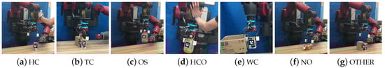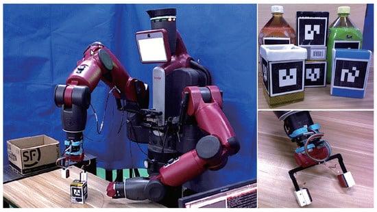 A Baxter humanoid robot’s right arm is used to pick commonplace objects set before him. The robot is equipped with a 6 DoF Robotiq FT sensor, 2 Baxter-standard electric pinching fingers, as well as Baxter’s left-hand camera. Each finger is further equipped with a multimodal tactile sensor composed of: (i) a 4 × 7 taxel matrix that yields absolute pressure values; (ii) a dynamic sensor which provides a single capacitive reading in millivolts (mV) useful to detect tactile events; and (iii) an IMU and gyroscope []. Baxter’s left-hand camera is placed flexibly in a region that can capture objects in the collection bin with a resolution of 1280 × 800 at 1 fps (we are optimizing pose accuracy and lower computational complexity in the system). The use of the left-hand camera facilitated calibration and object tracking accuracy.