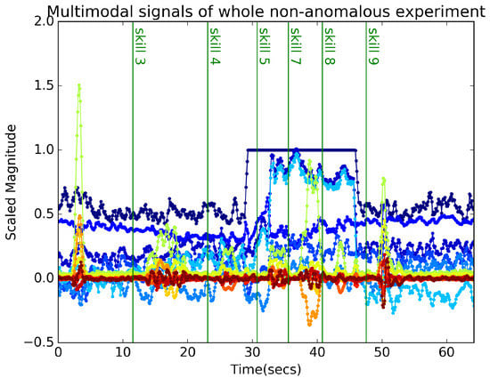 A kitting experiment is set up, where a robot and a human co-worker closely collaborate to place a set of goods in a packaging box. Specifically, a human co-worker is tasked to place a set of 6 objects on the robot’s “collection bin” (located in front of the robot) in a one-at-a-time fashion. The objects may accumulate in a queue in front of the robot. As soon as the first object is on the table, the robot identifies the object and places it in a packaging box located to the right of the robot. Thus, the robot picks an object and transports it towards the box, after which, the robot appropriately places each of the six objects in different parts of the box. The whole implementation is shown in Figure 4. The kitting experiment consists of 6 skills (Skill 3): Home → Pre-pick; (Skill 4): Pre-pick → Pick; (Skill 5): Pick → Pre-pick; (Skill 7): Pre-pick → Pre-place; (Skill 8): Pre-place → Place; (Skill 9): Place → Pre-place) that were effectively modeled by the dynamic movement primitives described in Section 3.1 and the ROS-SMACH (http://www.ros.org/SMACH). One-shot kinesthetic demonstrations were used to train DMP models for each of the skills of the kitting experiment. Please note that a skill’s starting and ending pose can be adapted if necessary, thus providing a flexible and generalizable skill-encoding procedure. The trajectory adaptations however increase the difficulty of assessing the sensory data for both anomaly detection and classification, due to the variability in the data collection even from nominal executions.