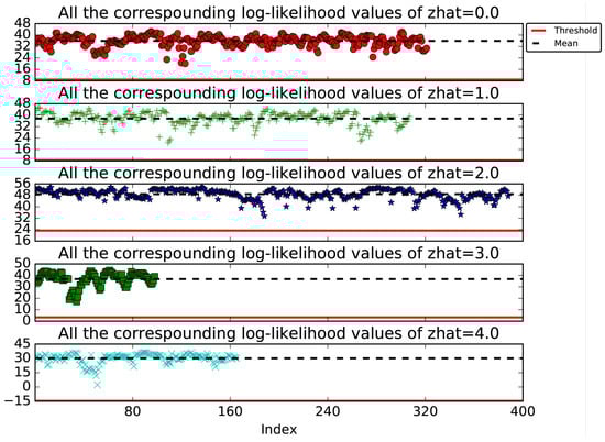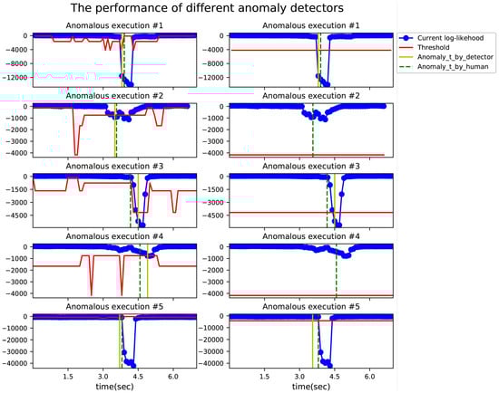 The proposed method generates the mapping pairs of marginal log-likelihood and the most likely hidden state at any time. In specific hidden state z, we calculated the fixed log-likelihood threshold from testing the nominal demonstrations by subtracting half the range between maximum and minimum from the minimum. Unlike the anomalous log-likelihood deviated by a certain standard deviation from the mean in [,], that is , where the symbol c is a constant value for adjusting the sensitivity of the detector, and are the estimated mean and standard deviation of the log-likelihood. Our implementations do not need to take the constant c into consideration for each skill or hidden state.