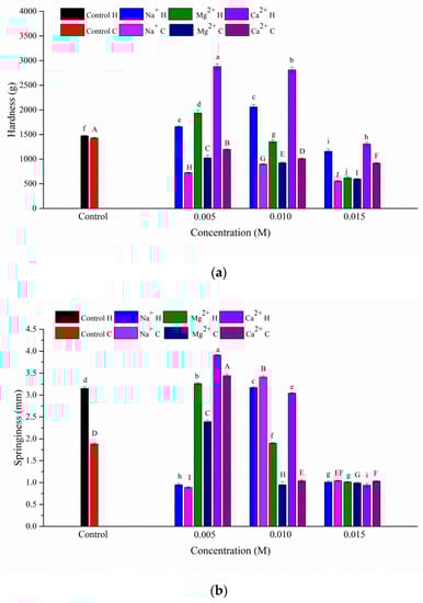 The gel textures of the heat-induced and cold-induced gels are shown in Figure 1. As can be seen from Figure 1a, an increase in hardness of the heat-induced gel was observed at lower concentrations, while the gel hardness was decreased at higher concentrations of Na+ (0.01–0.015 M), Mg2+ (0.01–0.015 M), and Ca2+ (0.015 M). At the same concentration, Ca2+ resulted in the highest gel strength. The hardness of the cold-induced gel was decreased. These results might be due to the gel strength being related to the amount of protein involved in the formation of the network structure and the forces forming the network structure [23,24,25]. The addition of Na+ diminishes repulsive forces, and protein–protein association occurs, forming a self-supporting gel [26]. Mg2+ and Ca2+ at lower levels may act as a bridge between negatively charged residues, which would promote protein aggregation with increased gel strength [27]. Additionally, excessive salt ions may result in excessive aggregation of proteins, which would decrease the gel strength. Salts at high levels might also compete for water, causing the “salting out” effect, with gels in turn being less soluble and weaker [28]. The strengths of gels containing Ca2+ and Mg2+, which had the same divalent ions, were very different. This difference resulted from dissociation of the two salts in aqueous solution. The strength of gels is affected by the type of cation [29]. Thus, the effect of Ca2+ on the strength of the heat-induced gel was stronger than those of Na+ and Mg2+.