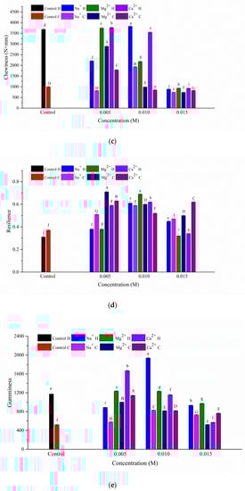 The springiness and chewiness of heat-induced and cold-induced gels both increased at 0.01 M Na+, 0.005 M Mg2+, and 0.005 M Ca2+ as shown in Figure 1b,c. Springiness measures the degree of springing back after being deformed under the first compression [21]. Chewiness signifies how much energy is needed to crunch a semi-solid food [21]. If hardness and springiness are high, it requires more mastication energy in the mouth. High springiness will be obtained when the gel structure is broken into a few large pieces during the first TPA (texture profile analysis) compression, while low springiness results from the gel breaking into many small pieces [30]. The resilience and gumminess of heat-induced and cold-induced gels both increased as shown in Figure 1d,e. Resilience is the ratio of recoverable energy when the first compression is relieved and gumminess is the product of stress at 70% compression [21,26]. The results indicated that disulfide bonds played an important role in the network formation of heat- and cold-induced gels. Gel cohesiveness is often used as an index of the ability of a gel to maintain an intact network structure; it indicates how well the product withstands a second deformation compared to the first deformation [31]. The results showed that salt-induced aggregates of gels with different divalent and monovalent cations showed decreased cohesiveness as the concentration increased to 0.01 M, as shown in Figure 1f. The results were in good agreement with those of Kaewmanee, Benjakul, and Visessanguan (2009) who reported that cohesiveness was slightly decreased when the salting time was increased in salted eggs [32]. Based on the texture data, the addition of Na+ (0.01 M), Mg2+ (0.005 M), and Ca2+ (0.005 M) before spray drying led to stronger gels, with the hardness, springiness, gumminess, and chewiness of the heat-induced gels being greater than those of the cold-induced gels, while the cohesiveness and resilience were smaller than those of the cold-induced gels.