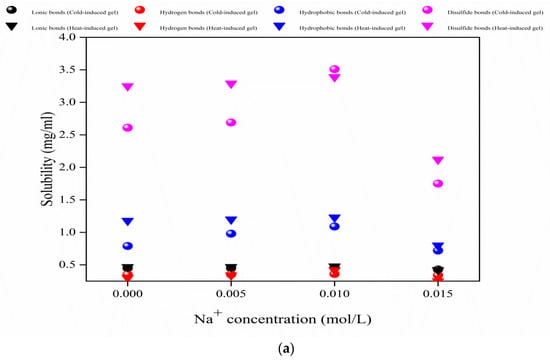 Ions could enhance the interactions within the gel system when the ionic concentrations were from 0.005 to 0.01 M, and the hydrophobic interactions and disulfide bond interactions were the main interactions within the gels [23,46]. Heat-induced gels had stronger interactions than cold-induced gels. This was consistent with previous research on gel texture and WHC [47]. The interaction between salt ions and SPI was increased at low ion concentrations and this interaction was decreased at high ion concentrations.