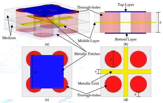 The PM proposed in this paper is a composite medium structure and can meet the requirement of wideband. Furthermore, the total weight and fabricating cost of huge radome can be significantly decreased by air through holes. The frequently-used material with a relative dielectric constant of 4.4 is adopted in this article. Using the through holes structure, a 2.70 equivalent dielectric constant can be obtained and an FSS structure is shown in Figure 1. The structure is partially optimized base on references [6,8], both the processing difficulties and FSS performance have been taken into consideration for the geometric dimensions. There are four perforations through each FSS periodic unit medium, which aim to reduce the equivalent dielectric constant of the dielectric plate and decrease the weight, red cylinders in Figure 1 are the air through holes. The top and bottom layers are the same metallic patches, shown as the blue patches in Figure 1. The middle layer is a square metallic grid shown as the yellow part. The unit is a 4 × 4 mm2 square with the following values: h = 2 mm, w = 2 mm, a = 0.5 mm, b = 0.5 mm, d = 1 mm.