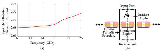 Based on the above theory, the electromagnetic parameters of the periodic units can be calculated. The equivalent relative dielectric constant of the PM FSS structure in Figure 1 is shown in Figure 2a. This curve states that the medium has an effective dielectric constant which changes in the 2.68 to 2.72 range within 6 to 25 GHz. The change in value is the effect of the vector field correction term related to the frequency. The variation is small because of the thin FSS unit thickness and the relatively simple background. The slight dielectric constant variation has little impact on the radome manufacture, even the process specification of distinguished corporation may have a 0.05 relative dielectric constant variation [27].