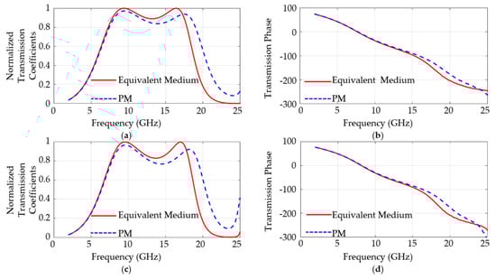 The FSS unit is simulated using the Finite Element Method (FEM) method in the infinite periodic structure, as shown in Figure 2b. The simulated transmission coefficients result of the transverse electric (TE) incident wave through the planar FSS surfaces are shown in Figure 3, where the equivalent medium means an equivalent 2.70 dielectric constant medium in the figure, and the transmission phase means the phase variation of the transmitted wave from the FSS unit upper surface to the lower surface. The two curves are the results of the equivalent 2.70 dielectric constant medium and the PM FSS, respectively, and the results of the 30° incident wave are also shown. From the comparison of the results, the two FSS with different media have very close transmission coefficients within the operating frequency range, especially the transmission coefficients phase. As far as the normalized transmission coefficients is concerned, transmission coefficients in the 2 to 8 GHz range are almost the same because the FSS is not in its working band, small dielectric constant variations can hardly change the transmission coefficients. In the 8 to 17 GHz range, the equivalent 2.70 dielectric constant medium has better transmission coefficient values because this FSS structure is intended for an ideal 2.70 dielectric constant, while the PM FSS dielectric constant is not equal to it, thus reducing the performance. And in the 17 to 25 GHz range, the wavelength of the incident wave gets much closer to the unit dimension and perforation size, thus more portions of the incident wave are transmitted through the FSS. The transmission phase curves have only minor differences for reason that the tiny change in dielectric constant value of the ultrathin FSS has little effect on the phase. A profound study on the periodic unit transmission performance is related to the transmission characteristics in the complex dielectric waveguide and some other theories and is not the main content of this paper.