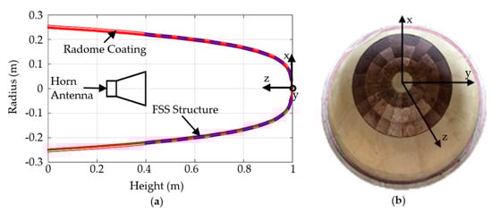 where the polynomial coefficients are the fitting results of the radome from reference [26] and are shown in Table 1. The PM FSS partially cover the radome, as in Figure 5a the blue doubled imaginary line is shown. This partial coverage is for the measurement and fabrication convenience because only the upper space radiation patterns need to be considered. Ultimately, 19,488 periodic FSS units are needed for radome manufacture.