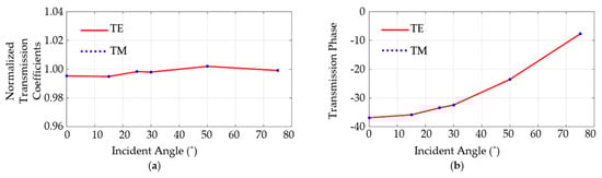 Radome 10 GHz transmission coefficients of TE and TM modes with different incident angles: (a) Normalized transmission coefficients; (b) transmission coefficients phase.