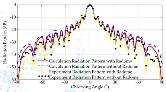 The physical optic method is adopted in order to consider the influence of different incident angles. Combining this method—the radome structure and horn antenna position—the incident angle at every point of the radome can be ascertained. Thus, the incident angle can be utilized to compute the small scale curved radome transmission coefficients, while considering the radome as a local plane. For each radiation direction, the intersection position of rays and the radome in the transmitting direction can be determined. At the intersection positions, the incident wave polarization is decomposed into a TM mode, which is parallel to the incident plane, and a TE mode, which is perpendicular to it. Multiplying these by the radome transmission coefficients and then synthesizing all the data, the radiation fields in the radiation direction are eventually acquired. Figure 7 shows the 10 GHz radiation patterns with and without the radome, the experimental results are also shown. The radome is experimented in the microwave anechoic chamber and a wideband highly directional horn antenna is fixed in the radome as shown in Figure 5a. The radome and the antenna are fastened to the rotation axis of the antenna automated test system in the chamber. Far field of the radiated electric field is received by another horn antenna. All the results are eventually compared in Figure 7 after data processing. Normalization of the data are not shown for the reason that the normalized curves overlap each other at both ends and cannot indicate the details.