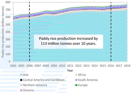 Paddy rice production worldwide (data adapted from reports of FAO between 2006 and 2018 [4,5,6,7,8,9,10,11,12,13,14,15,16]); values for 2017 and 2018 are estimated and forecasted data according to the latest report of FAO [4].