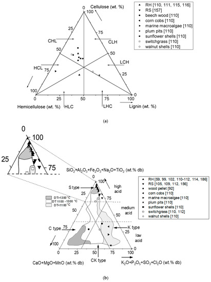 In Table 1, organic and inorganic types of biomass samples are defined according to Vassilev et al. [110,182,183,184]. Accordingly, Figure 2 illustrates a possible biomass classification based on the organic and inorganic composition. In Figure 2a, biomasses are arranged according to their relative share of cellulose, hemicellulose and lignin. For the majority of biomasses, cellulose is the predominant macromolecule based on the weight portion [110] followed by hemicellulose and lignin (Cellulose > Hemicellulose > Lignin, i.e., CHL). Marine organisms are usually characterized by hemicellulose as the predominant macromolecule and particularly low contents of lignin (Hemicellulose > Cellulose > Lignin, i.e., HCL). Nut shells and pits are often located in the LCH region based on their high lignin contents. RH and RS are usually located in the CHL region and in some cases also in the HLC region in Figure 2a [111]. Figure 2b shows fuel ashes dominated by components in the silicon, calcium, and potassium corners or between the calcium and potassium corners with S, C, K, and CK types, respectively [184]. Moreover, sub-types of HA, MA, LA represent high, medium, and low acid tendencies, respectively [184]. In Figure 2b, wood indicates the mean value of 249 datasets for evaluated wood pellet samples presented by Pollex et al. [92,185]. According to Figure 2b, both RH and RS have very low amounts of CaO + MgO + MnO in their fuel ash compositions compared to wood. On the other hand, the silica-based group of metal oxides (SiO2 + Al2O3 +Fe3O4 + Na2O + TiO2) is higher in both RH and RS fuel ashes compared to wood fuel ash. Among the RS and RH fuel ashes, RH fuel ash has higher K2O + P2O5 + SO3 + Cl2O in its inorganic composition. Figure 2b was defined based on empirical findings regarding ash melting tendencies of dedicated fuel assortments and can be divided into three distinct sections with low (<1100 °C), medium (1100–1300 °C) and high (>1300 °C) initial deformation ash fusion temperature (DT) [184]. RH is located close to the area associated with high DT, Figure 2b. Accordingly, it is expected that RH shows low melting tendency during the combustion process. In contrast, RS is located near the area associated with low DT; therefore, it is anticipated that RS shows a higher melting tendency during the combustion process than RH. However, some data points in Figure 2b are outside of the defined areas for which ash melt investigations are available, and it indicates some research gaps in knowledge. Therefore, scientific work must be carried out here to close the gaps.