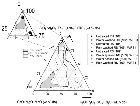 As illustrated by Figure 4, the effect of pre-treatment is more prominent in RS than in RH. According to Figure 4, simple water washing can change the position of RS from close to low melting temperature region to a high melting temperature part. This shift is far less pronounced for RH, which shows that washing does not have a drastic effect on the melting tendency of RH. In Figure 4, data points for original and treated RH and RS are outside of the defined areas and it shows gaps in knowledge, which should be closed in future studies. Table 4 provides an overview of pre-treatment strategies which were used in Figure 4.