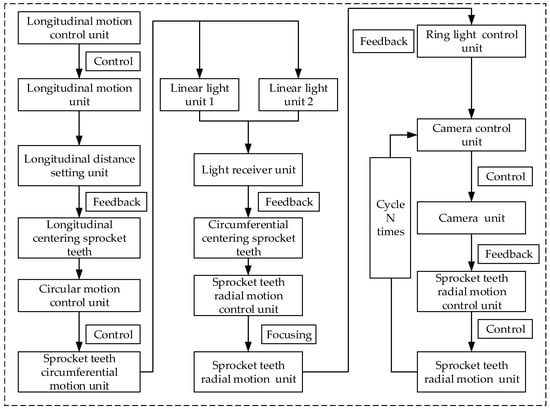Firstly, the longitudinal motion unit is driven to move in the longitudinal direction by the longitudinal motion control unit and stops when the moving distance reaches the set distance of the longitudinal distance unit. As a result, the camera unit is aligned with the longitudinal row of teeth. Secondly, the two linear light switches are turned on using linear light control unit, and the circular slider driving module is driven to move with the help of the circumferential control unit. When the light receiver unit simultaneously receives the signals from the two lights reflected back through the tooth surface, the circular slider driving module stops moving, which means that the camera unit is aligned with one of the teeth in the circumferential direction. Thirdly, the radial motion unit is driven to the designated focal length position by the sprocket tooth radial control unit, and the step distance is set to one N of the sprocket tooth height. The camera is driven by the camera control unit. Each step forward, the camera takes a picture, which cycles N times. The radial motion unit stops moving and returns to the original position, and then sequence image acquisition is completed.