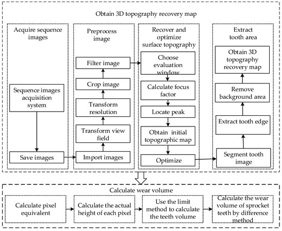First of all, the collected sequence images are read into the computer, and the field of view and resolution and cropping of all N-frame sequence images are transformed according to the proportional relationship of the target region of the N-frame sequence image. Normal distribution operator image filtering is used to filter the sequence images to obtain the same resolution. The pre-processed sequence images have N frames of the field of view. Therefore, N-frame pre-processed sequence image of the same resolution and field of view are obtained. Then, the clear pixel points of each pre-processed sequence image are extracted in order to construct a full-focus image. Then, the proposed adaptive method is used to select the focus evaluation window of any pixel in the full-focus image. The focus factor of each pixel in the pre-processed sequence image is calculated and the sequence image number corresponding to the maximum focus factor of all pixels in the full-focus image is obtained. The sequence image number is taken as the depth value of the corresponding pixels to form the initial depth map of the full-focus image. Next, a full-focus image is obtained with the help of image binarization, inversion, filling and contour recognition, and the object contour is extracted. The extracted object contour is applied to the initial depth map and the region outside the object contour is hollowed out to obtain a three-dimensional shape recovery map of the object. Lastly, the wear volume is calculated. The pixel equivalent and actual depth value of each pixel in the complete 3D topography is calculated, the tooth volume is determined using the limit method and the volume difference and wear volume between the recovered tooth model and the actual tooth model are calculated using the difference method.