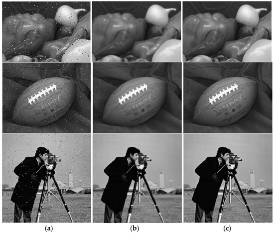 Figure 10 shows the noise and filter processing results with a density of 0.01. Here, the first, second and third columns show images with density of 0.01, images processed using median filtering and images processed using normal distribution operator filtering, respectively. As shown in Figure 10a, the images contain large number of errors. Note that these errors are reduced significantly by filtering the noise image. In addition, the median filtered images (Figure 10b) are more blurred than the original image and the filtering effect is poor. However, images obtained via normal operator filter processing are closer in appearance to the corresponding original images.
