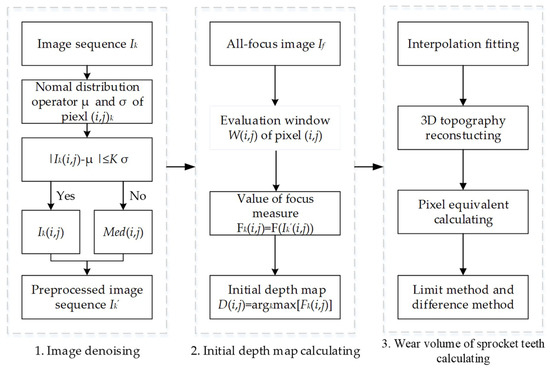 According to the above stated method, the process of the improved SFF algorithm is shown in Figure 13. The improved SFF algorithm has three main steps, consisting of the original sequence image de-noising, the initial depth map calculation, and the initial depth map refining. First, the image sequence Ik is detected by using the normal distribution operator, and a new grey value is assigned to a pixel determined as noise by using the median filtering method. Otherwise, the original pixel grey level is kept unchanged, and the preprocessed image sequence I’k is obtained (the threshold value K is 2.2.) Then, the Laplacian operator is used to extract the clear pixels in the preprocessed sequence image I’k of each frame to construct an all-focus image If. The adaptive evaluation window selection method is used to determine the evaluation window W(i, j) of each pixel (i, j) in the fully focused image; then, it calculates the focus measure value of each pixel of the image sequence I’k, and find the image number corresponding to the maximum focus measure value of each pixel (i, j) to obtain the initial depth map. Lastly, using the depth valued of all pixels, the 3D topography is reconstructed via interpolation. The pixel equivalent is calculated according to the width and height of the pixel and the tooth size of the 3D topography. The limit method is employed to obtain the 3D volume of the worn sprocket teeth and is combined with difference method to obtain the tooth wear volume.