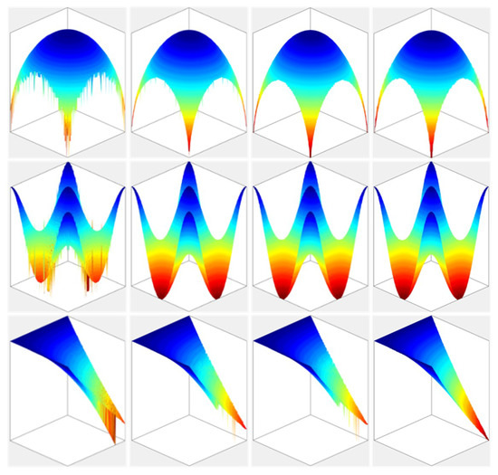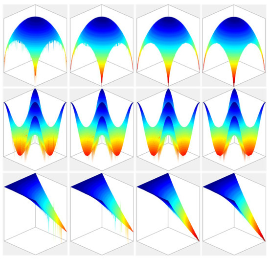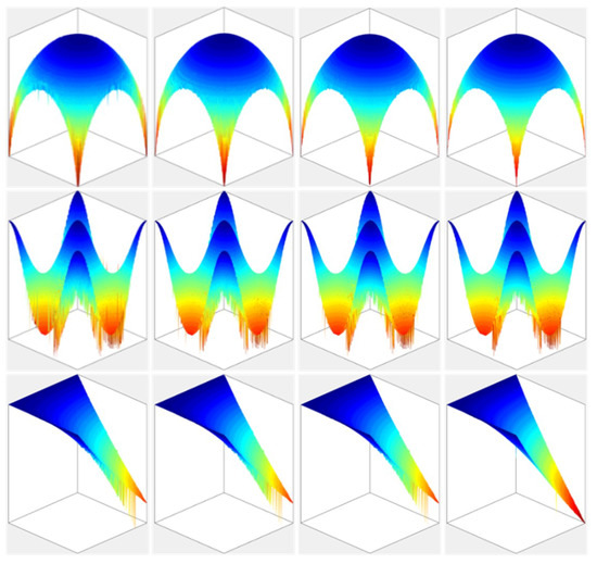 Figure 15, Figure 16 and Figure 17 show the initial depth maps of the three models when FSML, FTEN, and FGLV were chosen as the focus evaluation functions, and different evaluation windows were applied. Columns one to four in the figure are the three models of the 3D morphologies that were recovered and generated by using 3 × 3, 5 × 5, and 7 × 7 windows and the adaptive evaluation window proposed in this paper. Figures show that when the evaluation window is 3 × 3, the 3D surface topography of all three recovered models appears to have more error values. In comparing the recovery results of the three models, when the surface of the recovery object is smooth and we appropriately increase the evaluation window, the three types of evaluation functions can obtain accurate 3D topographic images. As the surface geometry tends to be complex, increasing the evaluation window does not obviously reduce the error effect. As can be seen from the recovery results of the spherical surfaces in figures, the error of the adaptive evaluation window is obviously less than that of the other evaluation windows, which indicates that the adaptive evaluation window in this algorithm is also effective for noisy image sequences.