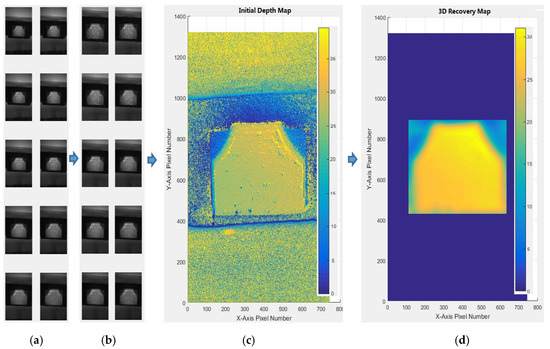 Image processing of the test: (a) the partial original images; (b) the partial pre-processed images; (c) the initial depth map; (d) the 3D recovery map.