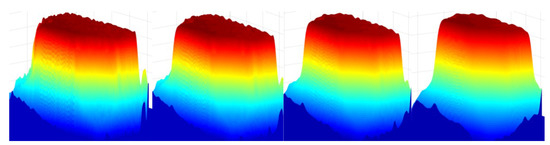 Firstly, image cropping and filtering are performed on the collected 100 frame sequential image. Then, different evaluation windows, evaluation function and peak positioning technology are used to acquire the initial depth map of sprocket tooth. Finally, the background area is removed by image segmentation technology, and the 3D recovery map of sprocket tooth is obtained. Figure 19a,b are the partial original images and pre-processed images of 100 frame sequential images respectively. Figure 19c,d are the initial depth map and the 3D recovery map of sprocket teeth respectively.