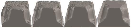 To further quantitatively verify the accuracy of the adaptive evaluation window, the degree of similarity between the reconstructed 3D model and the original model was deeply analyzed, and a further experiment was carried out. First, MATLAB (The MathWorks Inc., Natick, MA, ver.2015b) software was used to extract the 3D surface point data in Figure 20, and the extracted point data was saved in the txt folder; then, the IMAGEWARE software was used to read the point data under the txt folder to form a point cloud image, and reverse engineering was applied to restore the point cloud to a curved surface. Finally, the surface was formed to a 3D model in the SolidWorks software, as shown in Figure 21; from left to right, the reconstructed 3D entities of the 3 × 3, 5 × 5, 7 × 7 windows and the adaptive evaluation window were obtained by the FSML focus evaluation operator.