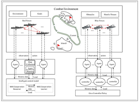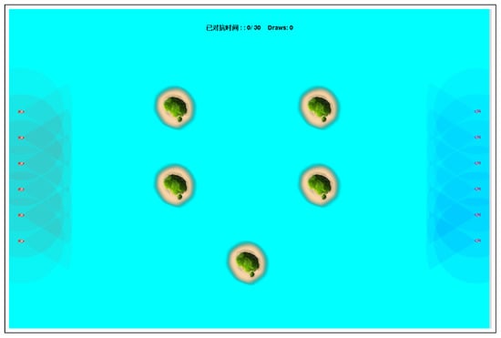 In the context of multi-surface vehicles’ modeling and design [,,], an unmanned surface vehicles (USVs) system is one of the development trends of modern weapon equipment []. The unmanned surface vehicle system has become an important means of information confrontation, precision strikes, and special combat tasks in future war []. Over the years, unmanned surface vehicles have long been applied to varying kinds of military applications in the real world. Some of the application domains include anti-mine warfare, submarine warfare, reconnaissance, and surveillance [,,]. Due to the open and complex dynamic combat environment, the USV combat system must develop in the direction of autonomy and synergy, and the future surface unmanned combat should have a strong autonomous capacity, be able to be controlled autonomously, and complete complex and diverse combat tasks independently or collaboratively in a complex uncertain environment []. However, human knowledge is difficult to apply directly to the coordination of USVs.