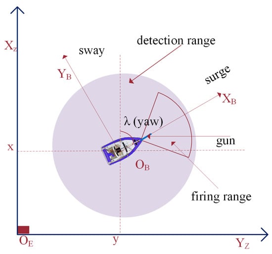 The USV agent model that is used by the intelligent training system for cooperative training and competition is equipped with a radar and weapon system. The radar of a USV can detect a hostile threat within it’s detection range. In this work, the weapon system of a USV consists of a calibrated gun with limited forward turning angle and firing range. A USV can turn in both directions (left or right) and with limited speed and turning radius r. In this study, only surge, sway, and yaw are used to describe the USV’s movement at sea, as shown Figure 2). Therefore, the kinematic relationship between the USV position in the global inertial frame XYZ and the boat body-fixed frame xyz can be defined as: