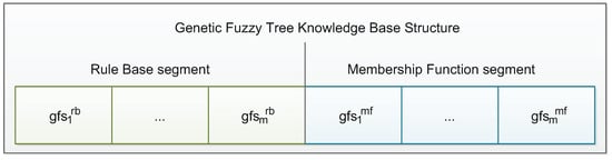 Although a GFS can be used to find KBs that optimize the fitness function, it is inefficient to use a single GFS for a complex control problem. In such a case, there is an increase in GA search space complexity, the tendency to have redundant rules, and KB size. Therefore, using genetic fuzzy trees (GFT) in [] helps to mitigate this problem. A GFT is, essentially, an ensemble of GFSs arranged in a tree structure according to a logical and conditional sequence of execution. A GFT enables the decomposition of a complex fuzzy control system (FCS) or GFS into logical sections with each node in the tree focusing on an aspect of the control problem. Each GFS in a GFT defines its own KB. Hence, the KB of a GFT consisting of GFSs may have the genetic structure (represented as a concatenated string) where and , , denote the RB and MF string/genome, respectively, of a given GFS. This structure can be seen in Figure 5.